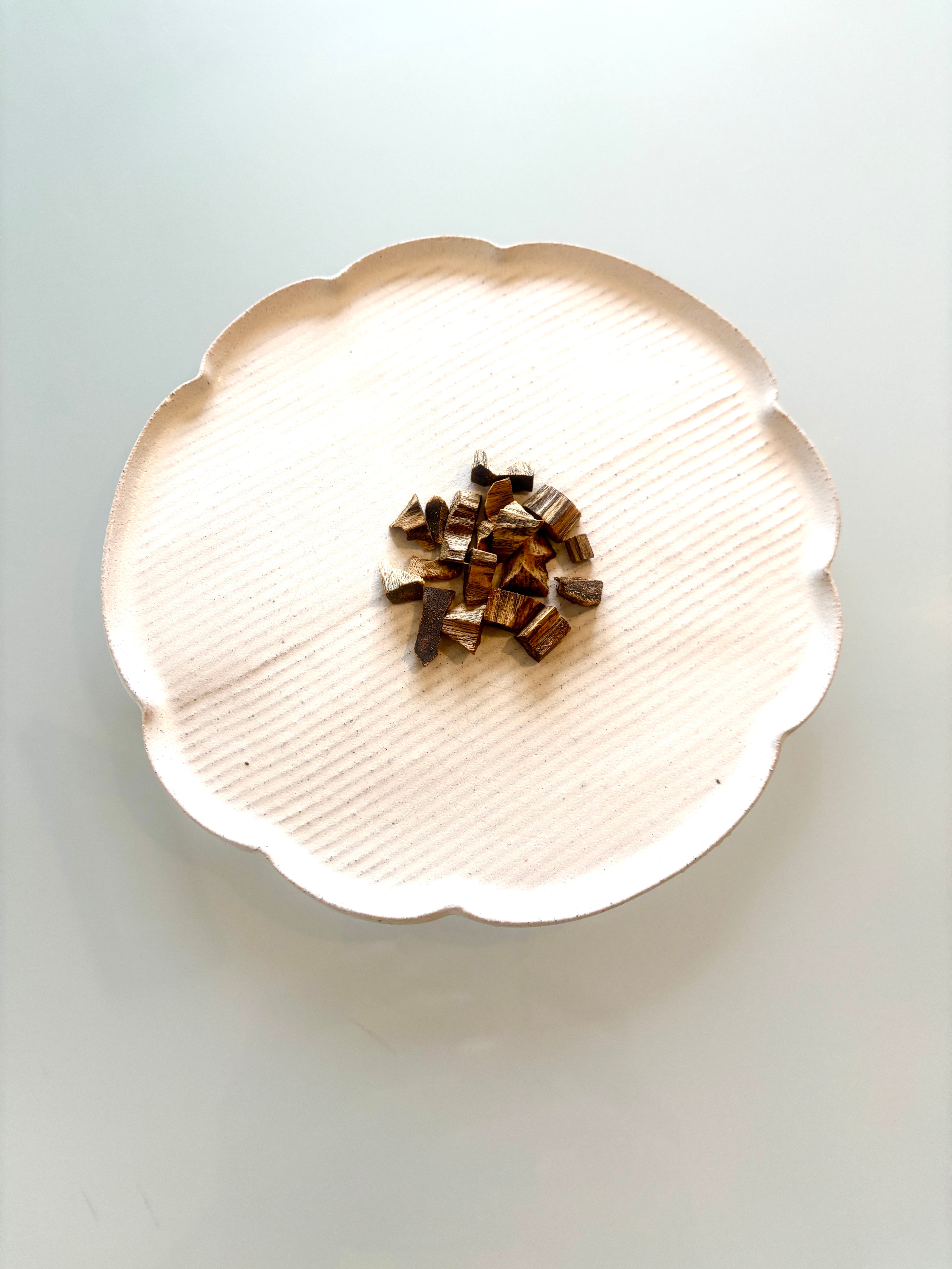 香炉に灰を敷き、炭を埋めて温めます。その上に雲母の薄片(銀葉)を置き、沈香を少量乗せてじっくり温めます。深い香りを堪能できます。